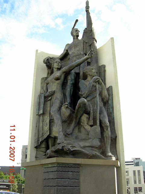 The sculpture features Kupe Raiatea, the great Māori explorer and discoverer of Wellington harbour, his wife Te Aparangi and tohunga Pekahourangi.